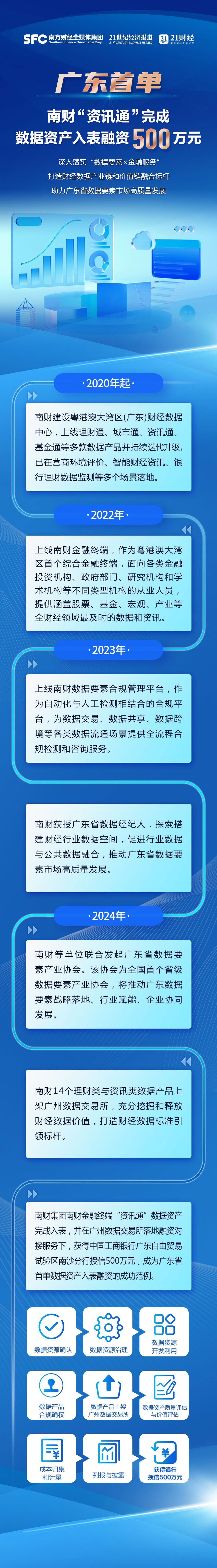 2024年2月,广东诞生首单数据资产入表融资成功范例——南方财经全媒体集团(以下简称“南财”)南财金融终端“资讯通”数据资产完成入表,并在此基础上更进一步,在广州数据交易所落地融资对接服务下,获得中国工商银行广东自由贸易试验区南沙分行授信500万元。